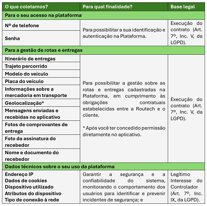 neste documento, a Routech será a Operadora dos dados pessoais. Contudo, em algumas